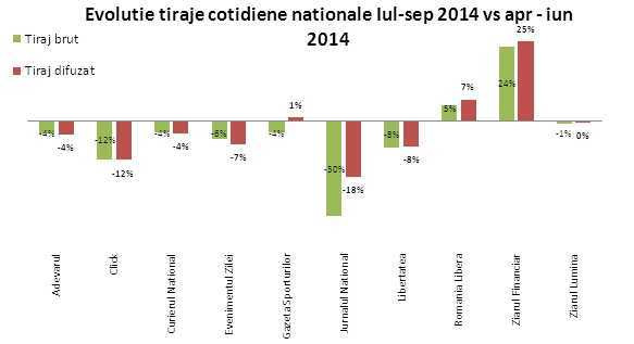 Fata de trimestrul similar al anului 2013 se observa o crestere a mediei tirajului tiparit cu aproximativ 7.38% si a tirajului difuzat cu aproximativ 7.75%. Tirajul vandut a inregistrat o scadere de aproximativ 15.1%.
