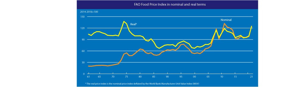 În luna noiembrie, indicele FAO al prețurilor la alimente a fost, în medie, de 134,4 puncte, atingând cel mai ridicat nivel pe care l-a avut din iunie 2011. În noiembrie, cele mai mari creșteri s-au înregistrat la cereale și lactate, urmate de zahăr, iar cele mai mici creșteri la carne și uleiuri vegetale.