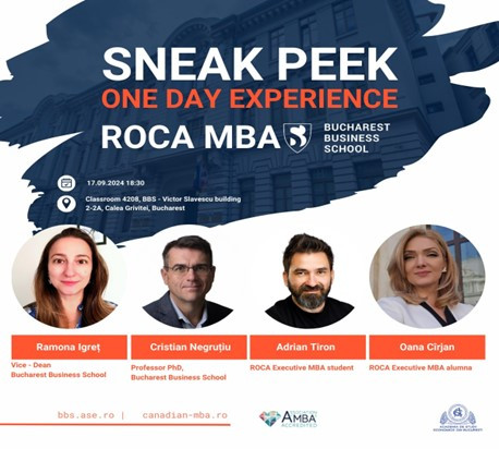 Înscrierile pentru cohorta 2024-2026 continuă până pe 20 septembrie, pentru ultimele 3 locuri disponibile - mai multe informații despre program și procesul de admitere le puteti gasi pe website: www.canadian-mba.ro. Bucharest Business School oferă oportunitatea potențialilor candidați, dar și tuturor celor interesați să urmeze un program de tip Executive MBA, să experimenteze sesiuni de cursuri, dar și să interacționeze cu studenți și absolvenți ai programului și, în același timp, să primească răspunsuri la diversele întrebări din partea echipei de management, în cadrul unui eveniment Sneak Peek în data de 17 septembrie. Detalii accesând linkul: ROCA Sneak Peek.