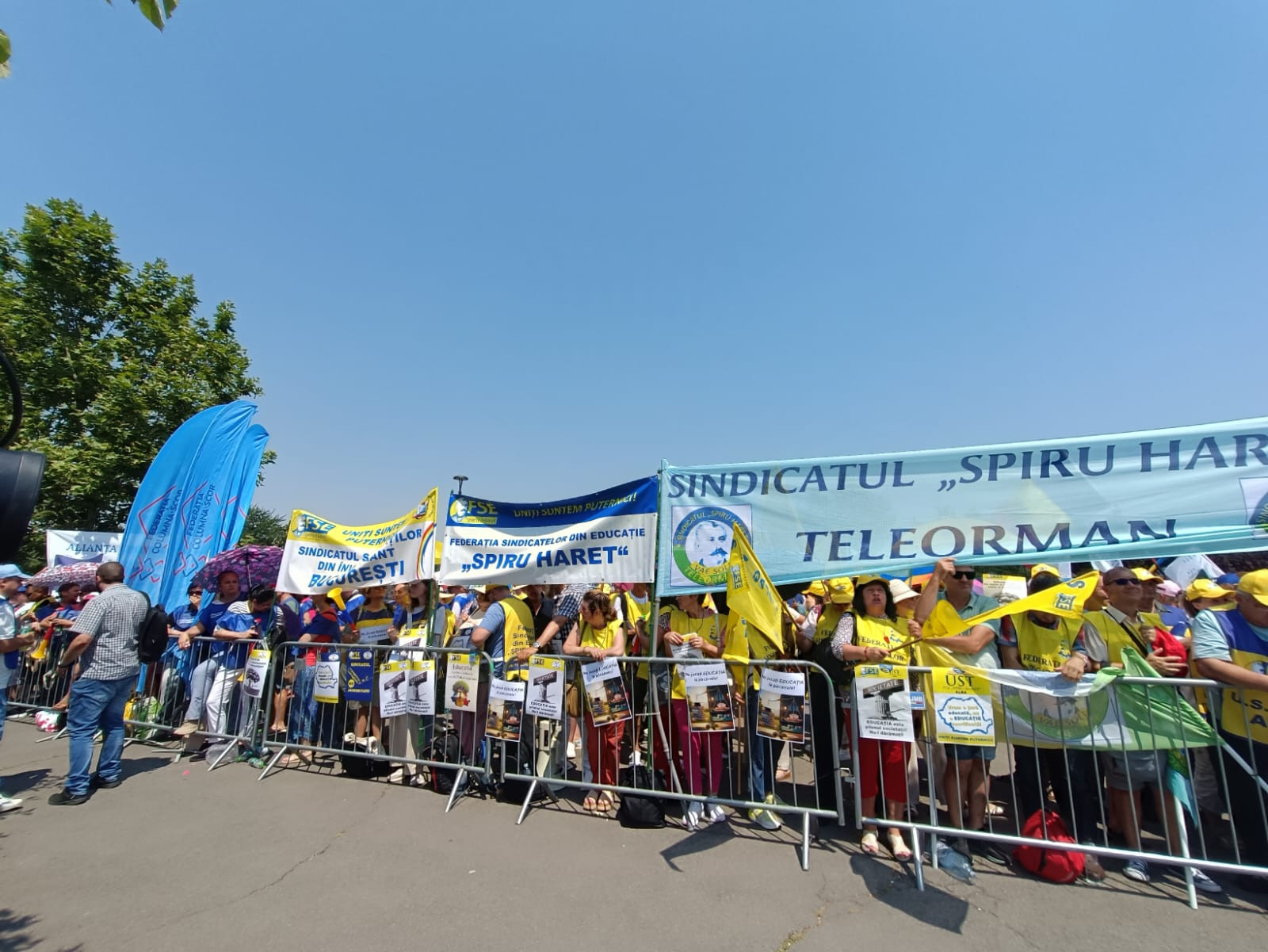 Când am ajuns, m-a întâmpinat o mare intensă de vuvuzele și de fluiere, exact ca pe stadion. Genul acesta de adunare gălăgioasă, stridentă, nu este deloc comun în rândul profesorilor, fiind în opoziție cu discreția cu care mulți ne-au obișnuit și de care ne aducem aminte din perioada în care eram elevi. Devine, așadar, trist când singura metodă a profesorilor de a se face auziți rămâne aceasta. Puținele locuri la umbră s-au „dat” repede, așa că mulți dintre ei au ales să se plimbe cu diverse pancarte în mână, iar cine s-a știut (probabil) mai rezistent la căldură a stat în față.