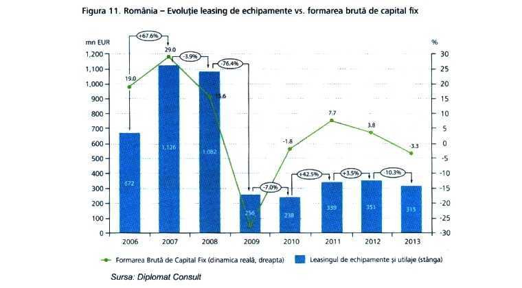 Momentul vulnerabil al pietei de leasing a fost anul 2009, atunci cand societatile de leasing au fost puternic afectate de criza financiara si noile contracte de leasing au scazut puternic la 1,3 miliarde de euro de la aproape 5 miliarde de euro in 2007. De atunci, valoarea anuala totala de contracte noi de leasing nu a inregistrat variatii considerabile, ceea ce a reflectat o oarecare stabilizare a pietei de leasing, desi conditiile economie au fost dificile, prin reducerea facilitatilor fiscale si contractia cererii de creditare a companiilor pentru echipamente si vehicule.