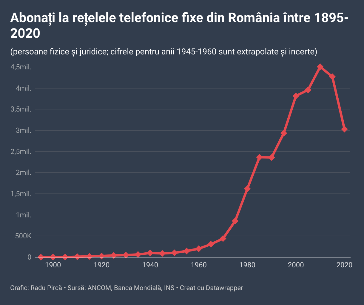 Ca urmare, posturile fixe au scăzut rapid, până la circa 1,53 de milioane, la nivelul anului 2022, dacă ne raportăm strict la persoane fizice. Dacă adăugăm și telefoanele fixe ale persoanelor juridice, acestea sunt undeva în jurul a 400.000. Cât despre telefoanele publice cu cartelă, care în 2004 ajunseseră să depășească 50.000 de posturi, ele practic nu mai există.