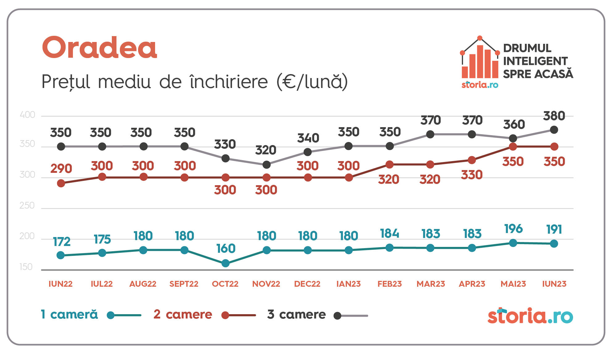 În Arad, prețurile medii ale chiriilor au rămas relativ similare față de luna mai. Totuși, față de luna iunie 2022, s-au observat creșteri de 17% la apartamentele cu trei camere.