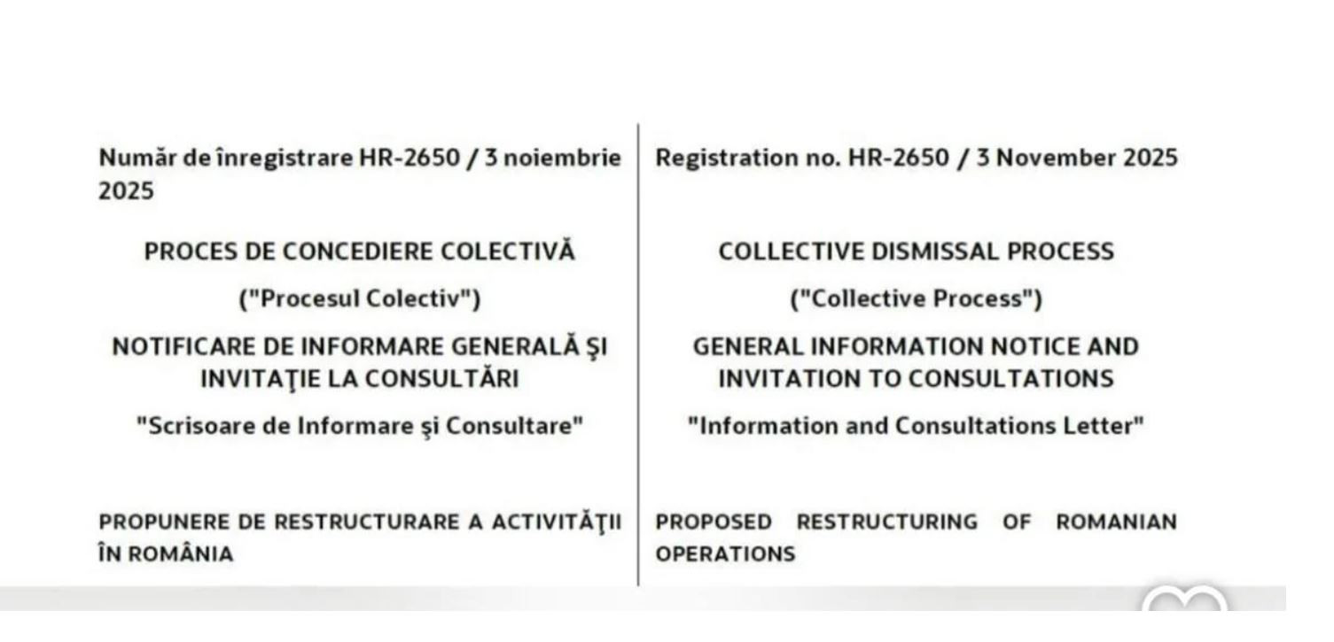 Trebuie spus și că pe forumuri au apărut mai multe discuții cu privire la faptul că ar exista un proces de concediere colectivă. Angajații ar fi primit o notificare de informare generală cu privire la acest proces, cât și o invitație la consultări. Practic, potrivit mai multor discuții din spațiul public, există o propunere generală de restructurare a activității în România.