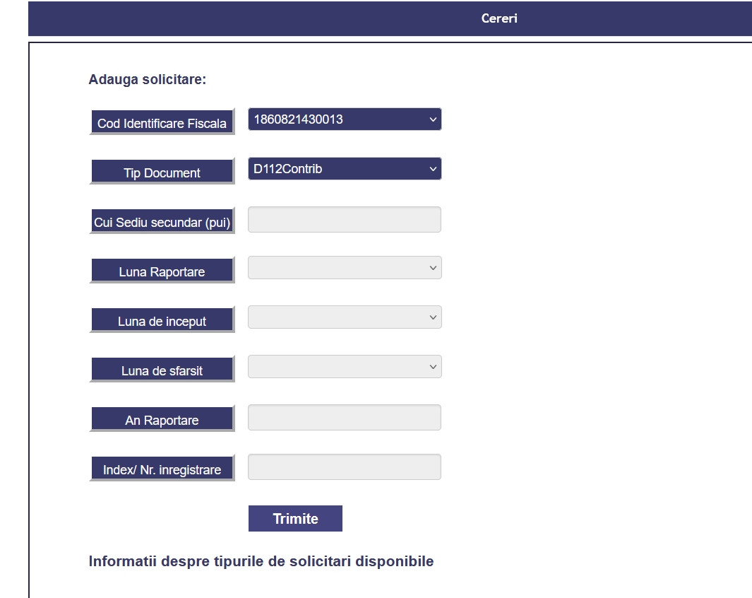 După ce ai contul activ în SPV, verificarea contribuțiilor plătite de angajator durează doar câteva minute. Te conectezi în platformă, mergi în meniul orizontal și accesezi secțiunea „Solicitări”. De acolo apeși pe butonul „Informații” și selectezi opțiunea D112Contrib, formularul care îți generează situația contribuțiilor declarate lunar de angajator (vezi foto mai jos).