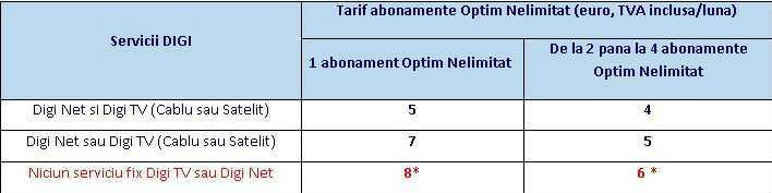 Mai mult, abonatii existenti Digi Mobil care si-au portat anterior numarul de telefon in reteaua companiei si nu au servicii fixe Digi Net si Digi TV contractate, vor beneficia automat de noile tarife, in functie de numarul de abonamente Optim Nelimitat contractate. Reducerea la abonament se va regasi in facturile clientilor existenti incepand din luna martie.