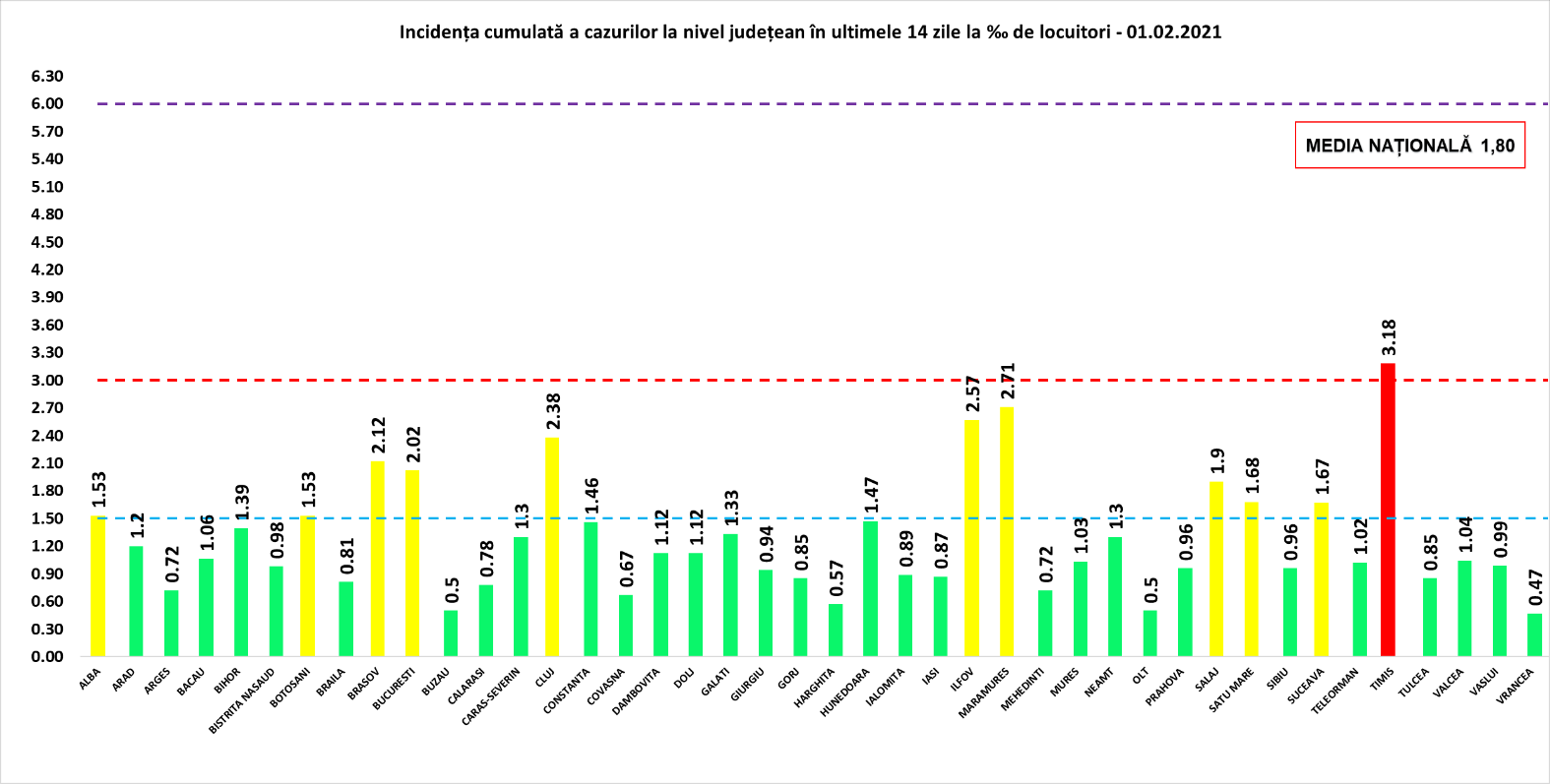 Timișul este singurul județ care rămâne în scenariul roșu (3,18/1.000). Cât despre București, rata de incidență în Capitală a scăzut până aproape de 2/1.000.