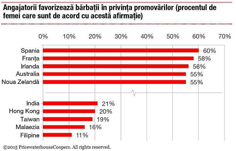 Mai mult, 43% dintre femeile Generatiei Y cred ca angajatorii sunt prea partinitori cu barbatii cand vine vorba de promovarea angajatilor– in crestere cu 14% fata de nivelul din 2011. Femeile Generatiei Y din Spania (60%), Franta (58%) si Irlanda (56%) considera ca angajatorii din tarile lor sunt cei mai partinitori cu barbatii , in comparatie cu Malaezia (16%) si Filipine (11%) unde femeile sunt mai optimiste.