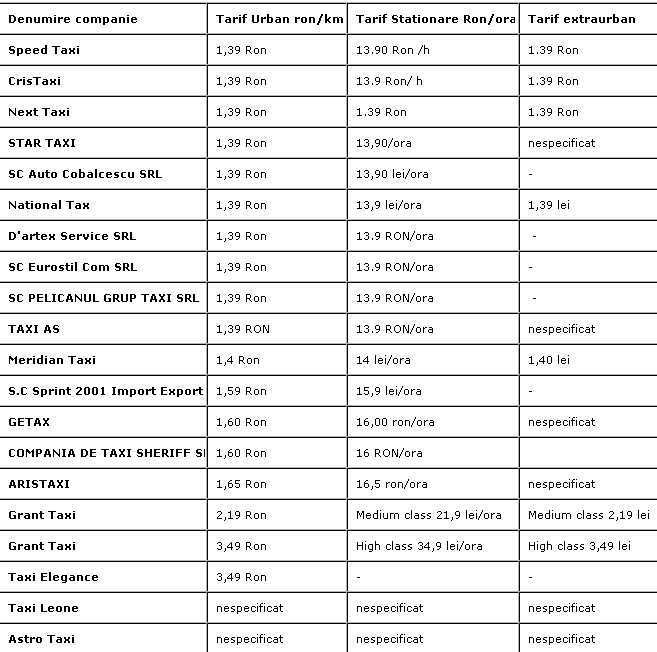 Cel mai mic tarif perceput de taximetristii din Bucuresti este de 1,39 lei, iar cel mai mare este de 3,49 lei, reiese dintr-un studiu realizat de Asociatia Nationala pentru Protectia Consumatorilor si Promovarea Programelor si Strategiilor din Romania (A.N.P.C.P.P.S).