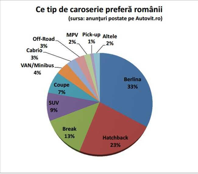 Spre deosebire de Vestul Europei unde predomina break-urile si hatchback-uruile, in Romania berlinele sunt in continuare foarte populare, cel mai des scoase la vanzare fiind BMW Seria 3, Audi A4 si Volkswagen Passat.