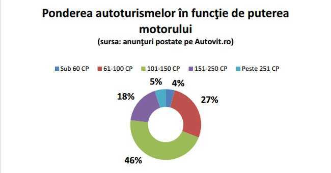 Cea mai populara categorie de anunturi vizeaza masinile cu o putere cuprinsa intre 101 si 150 CP (46%), urmata de automobilele cu o putere intre 61 si 100 CP (27%), pe pozitia a treia a clasamentului situandu-se masinile cu o putere a motorului intre 151 si 250CP.