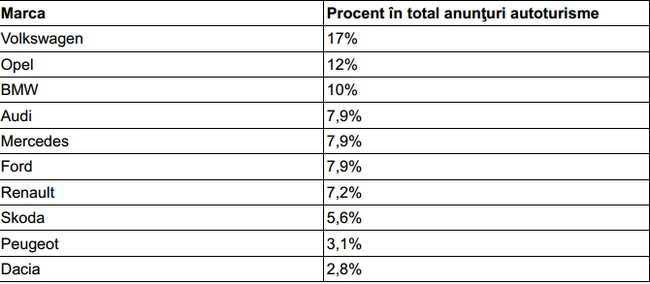 La fel cum se intampla si in cazul reinmatricularilor si al importurilor de masini second hand, Volkswagen domina si topul marcilor ce apar cel mai des in anunturile Autovit.ro. Opel se situeaza pe locul doi, iar marcile germane premium completeaza urmatoarele pozitii in top cinci.