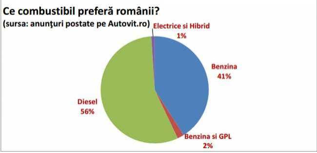 Clasificand masinile in functie de combustibil, expertii Autovit.ro au observat ca in 56% dintre anunturi se gasesc masini diesel iar in 41% masini pe benzina. Dominatia diesel-urilor nu e o surpriza in contextul popularitatii modelelor TDI de la Volkswagen si Audi. Aproape 2% reprezinta masinile ce pot functiona si pe GPL, in timp ce hibridele si electricele reprezinta sub 1%.