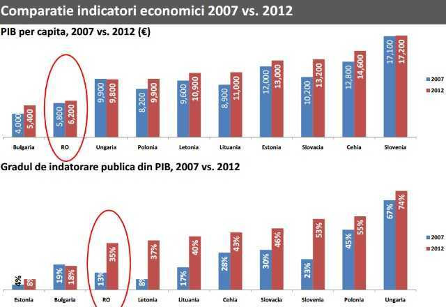 Romania este la coada clasamentului in evolutia PIB pe cap de locuitor in 2012 (6,200 euro) in contextul pietelor central si est europene (Slovenia – 17,200 euro). In ceea ce priveste evolutia gradului de indatorare publica din PIB, Romania are o pozitie mai buna, 35 de procente in 2012.