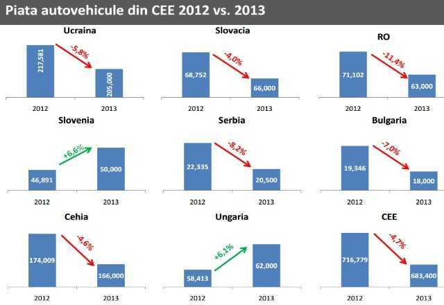 Romania este in scadere, prognoza este de 63.000 piata totala de autovehicule (-11,4% in 2013), cu mult sub media europeana de -4,7%. Cresteri usoare se observa in Slovenia de 6,6% si in Ungaria de 6,1%.