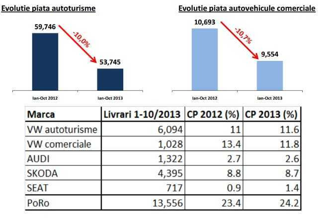 Piata de autoturisme a inregistrat un declin de 10% in primele 10 luni livrandu-se catre clienti doar 53.745 unitati. Acelasi lucru s-a intamplat si in piata de autovehicule comericale usoare unde declinul a fost de 10,7% fata de anul trecut livrandu-se catre clienti doar 9.554 de unitati.