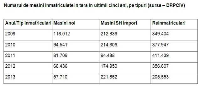 Piata masinilor noi a avut al saselea an consecutiv de scadere (2008-2013), in timp ce importurile de masini second-hand au crescut cu aproape 50.000 de unitati fata de 2012. Cea mai mare schimbare a fost insa la reinmatriculari, unde scaderea a fost extrem de mare: 150.000 de unitati.