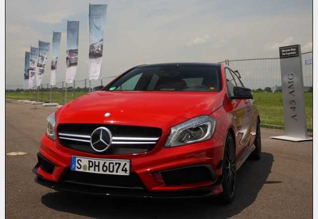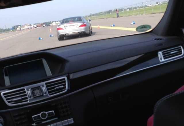 Pe pista Aeroportului Baneasa am avut ocazia de a conduce printre jaloane si de a fi pasager in patru modele AMG: SL 63 AMG , SLK 55 AMG, E 63 AMG, A 45 AMG.