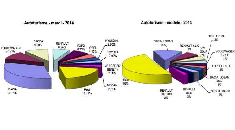 Cel mai bine vandut model pe piata romaneasca este Dacia Logan (11.285 unitati), urmat de Dacia Duster (5.796 unitati), Dacia Sandero (4.957 unitati), Skoda Octavia (3.473 unitati) si Volkswagen Golf (2.739 unitati).
