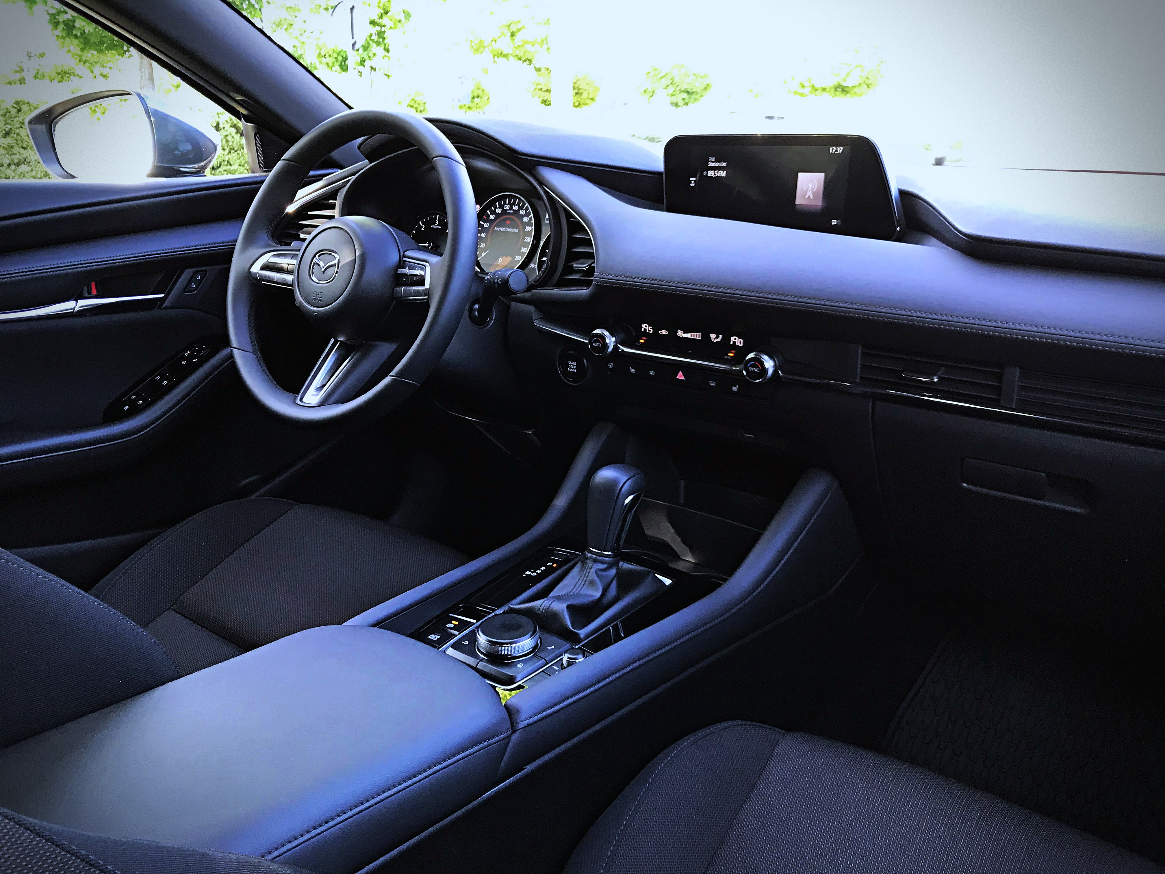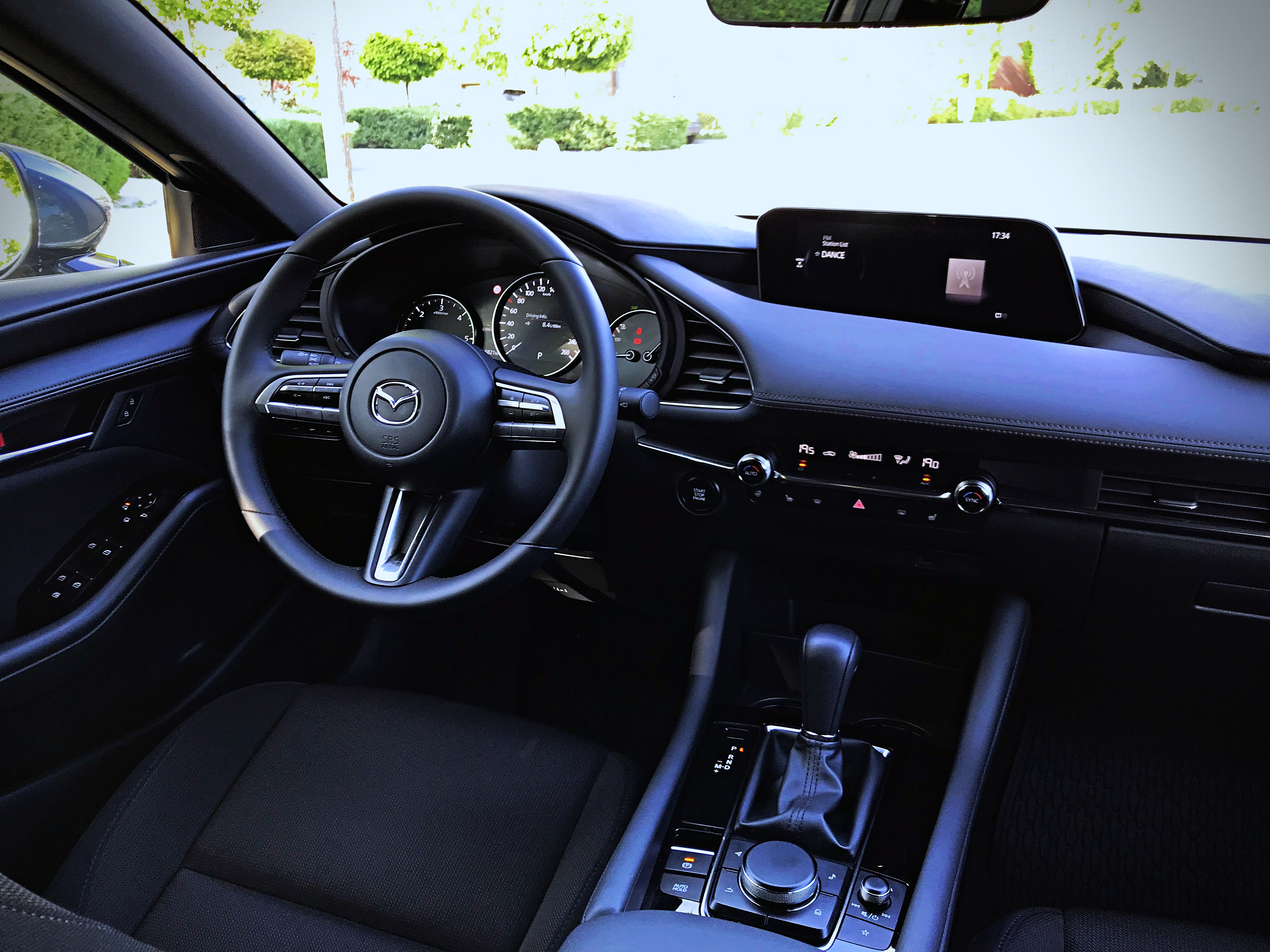 Mazda3 are o cabina minunata, simpla, cu putine butoane fizice pe consola centrala. La volan, in jurul tau, sunt numai materiale moi, iar scaunele confortabile par de pe modele din alt segment de pret.