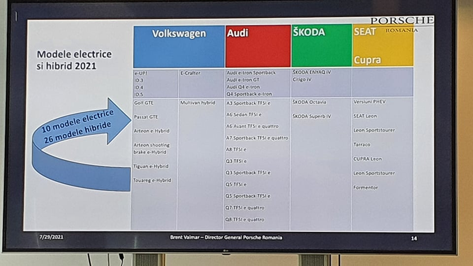 Portofoliul actual al Porsche România cuprinde 10 modele electrice (VW e-Up!, Id.3, Id.4, Id.5, E-Crafter, Audi e-tron Sportback, e-tron GT, Q4 e-tron, Q4 Sprtback e-tron, Skoda Enyaq iV, Citigo iV) și 26 hibrid.