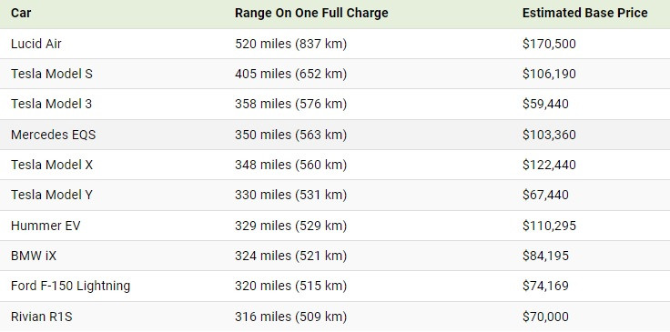 Vehiculul electric cu cea mai mare autonomie în Statele Unite ale Americii este un model produs de Lucid Air, care poate circula 837 kilometri la o singură încarcare a bateriei.