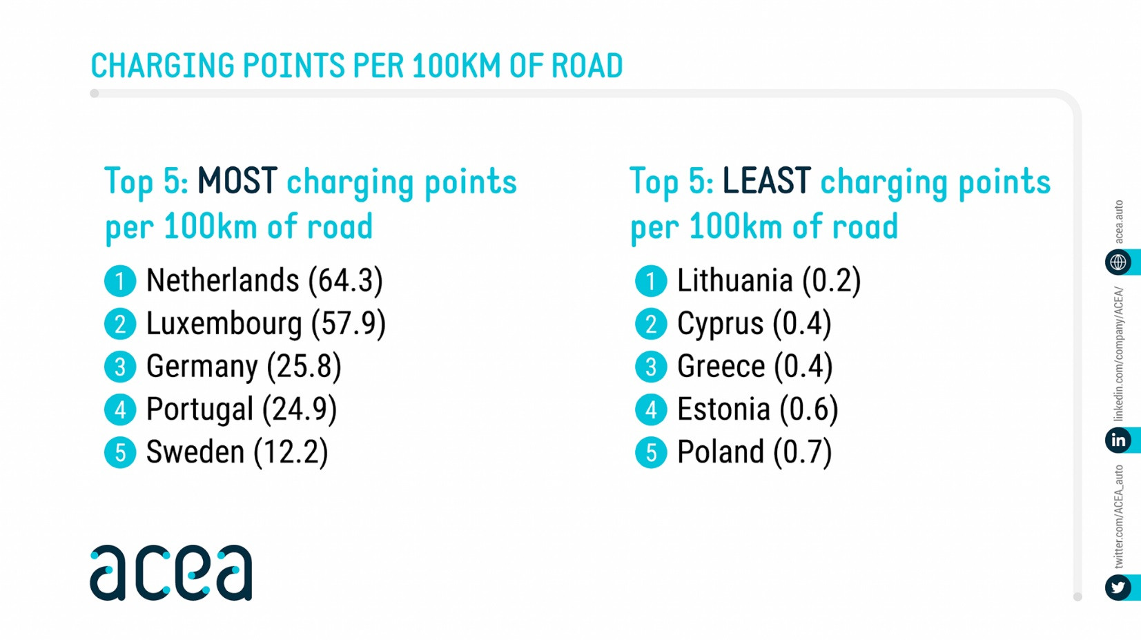 Conform unui studiu recent publicat de Lektri.Co, pe teritoriul României se regăseau, la finele lunii februarie, 3.389 încărcătoare publice, fără restricții (dintre care 857 CCS/CHAdeMO și 2.492 Type 2), distribuite în 1.503 locații. La nivelul UE, doar 1 din 7 puncte de încărcare oferă fast-charging, iar, la noi, acestea sunt chiar mai rare. În martie, ACEA informa că numărul stațiilor de încărcare din Uniune este de trei ori mai mic decât numărul de EV-uri. În România, în primele două luni din acest an s-au comercializat 2.247 vehicule electrice dintre care mai bine de 1.000 de unități au fost Dacia Spring.