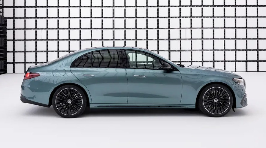 Din lateral se observă, în primul rând, mânerele ușilor care se retrag în caroserie, dar ceea ce nu se observă este că noul Clasa E este mai lung, dar și mai lat, decât vechiul model (care era lung de 4,9 metri și lat de 1,8 metri în versiunea cu ampatament scurt). Designerii au lucrat mult pentru a rafina forma mașinii, fiind atenți la forma aripilor, a capotei și a gurilor de aer, pentru a obține un Cx de doar 0,23.