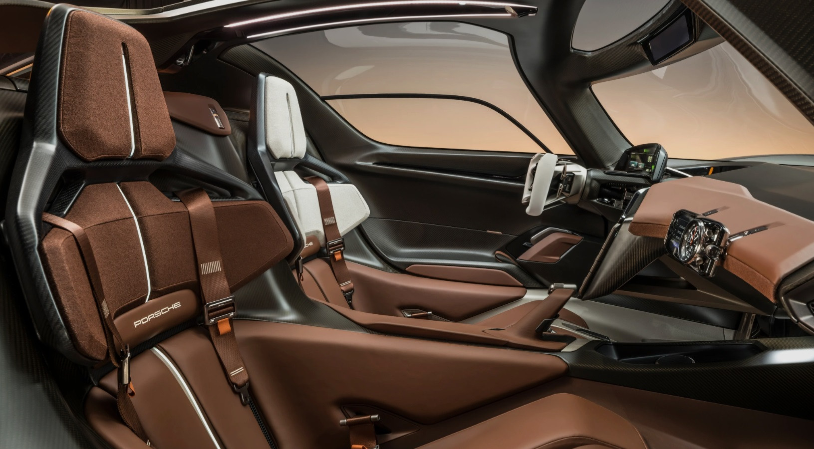 La interior, este loc de doar doi ocupanți, fiecare fiind obligați să încapă în niște scaune-scoică ultra-profilate și îmbrăcate în piele care te îmbrățișează în locurile esențiale pentru suportul necesar la viteze mari. Motivul? Porsche consideră că, dacă ar fi să producă acceastă mașină în serie, ar rezulta cel mai rapid model de stradă care a rulat vreodată pe Nurburgring-Nordschleife. De dragul aducerii aminte, menționăm că cel mai rapid timp al unei mașini road-legal pe „Iadul Verde” este un 6:35.183 și a fost reușit de Mercedes-AMG One, un hypercar cu motor din Formula 1 pilotat de Maro Engel. Cel mai rapid Porsche, un 911 GT2 RS cu kit aerodinamic Manthey Racing este cu peste opt secunde mai lent.