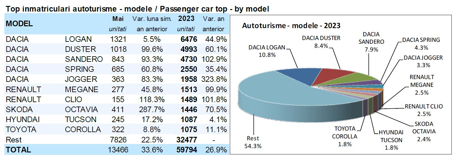 Cât privește segmentarea pe tipuri de autovehicule, segmentul SUV este pe prima poziție, cu o cotă de 41,9%, în scădere cu 4,3% față de 2022, urmat de Clasa C cu o cotă de 30,5%, în creştere cu 5,1% și Clasa B cu o cotă de 17,4%, în creştere cu 1,5% față de cota deținută în aceeași perioadă a anului trecut. În total, între ianuarie și mai s-au înmatriculat 59.794 de automobile noi în România, iar doar pe luna mai s-a înregistrat o creștere cu 30,5% a înmatriculărilor per total - adică inclusiv vehiculele utilitare și comerciale ușoare, pe lângă autoturisme.