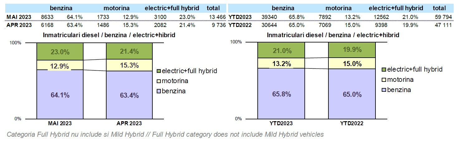 Pe de altă parte, autoturismele “electrificate“, respectiv cele electrice (100% și hibride plug-in), precum și cele full hybrid (care dispun şi de propulsie electrică fără încărcare din sursă externă), ajung să dețină, după primele cinci luni din 2023, o cotă de piață de 21,0%, care depăşeşte cu 7,8% cota deţinută de motoarele diesel. Autoturismele full electrice dețin o cotă de 9,0% din piață în primele cinci luni ale anului 2023 față de anul 2022 când reprezentau 7,7%.