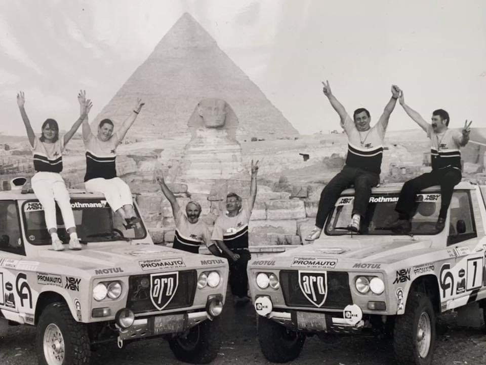 Bucurie pentru echipa lui Sarrazin (pe mașina din dreapta, cu mustață) după Raliul Faraonilor din '84