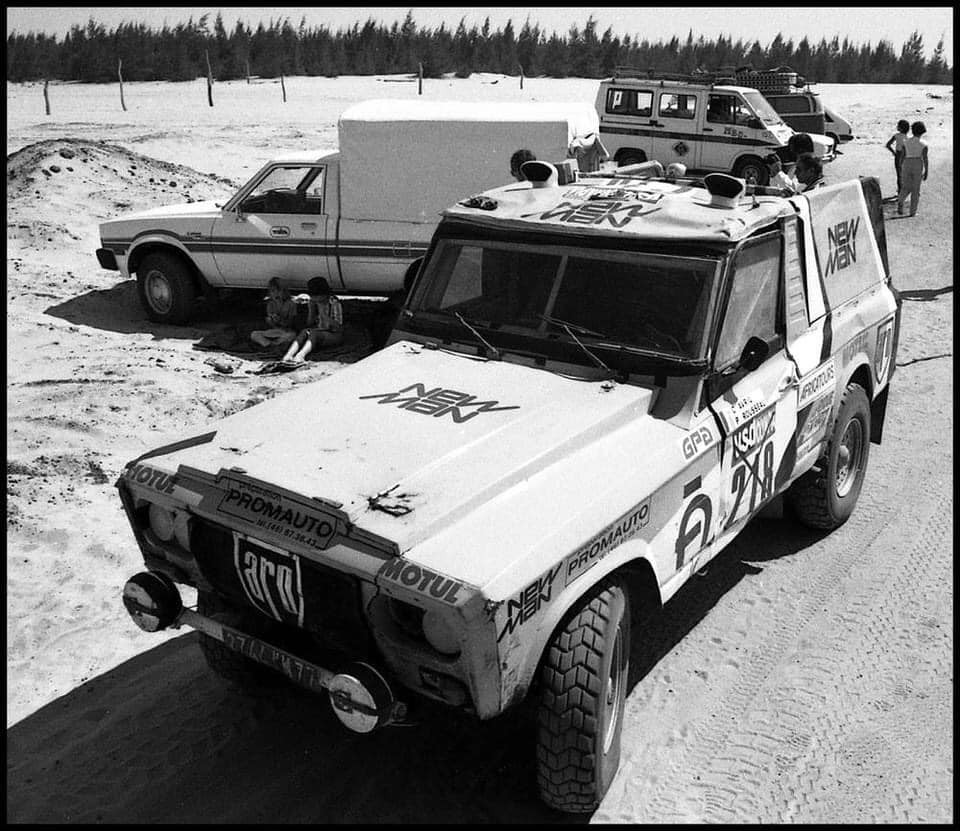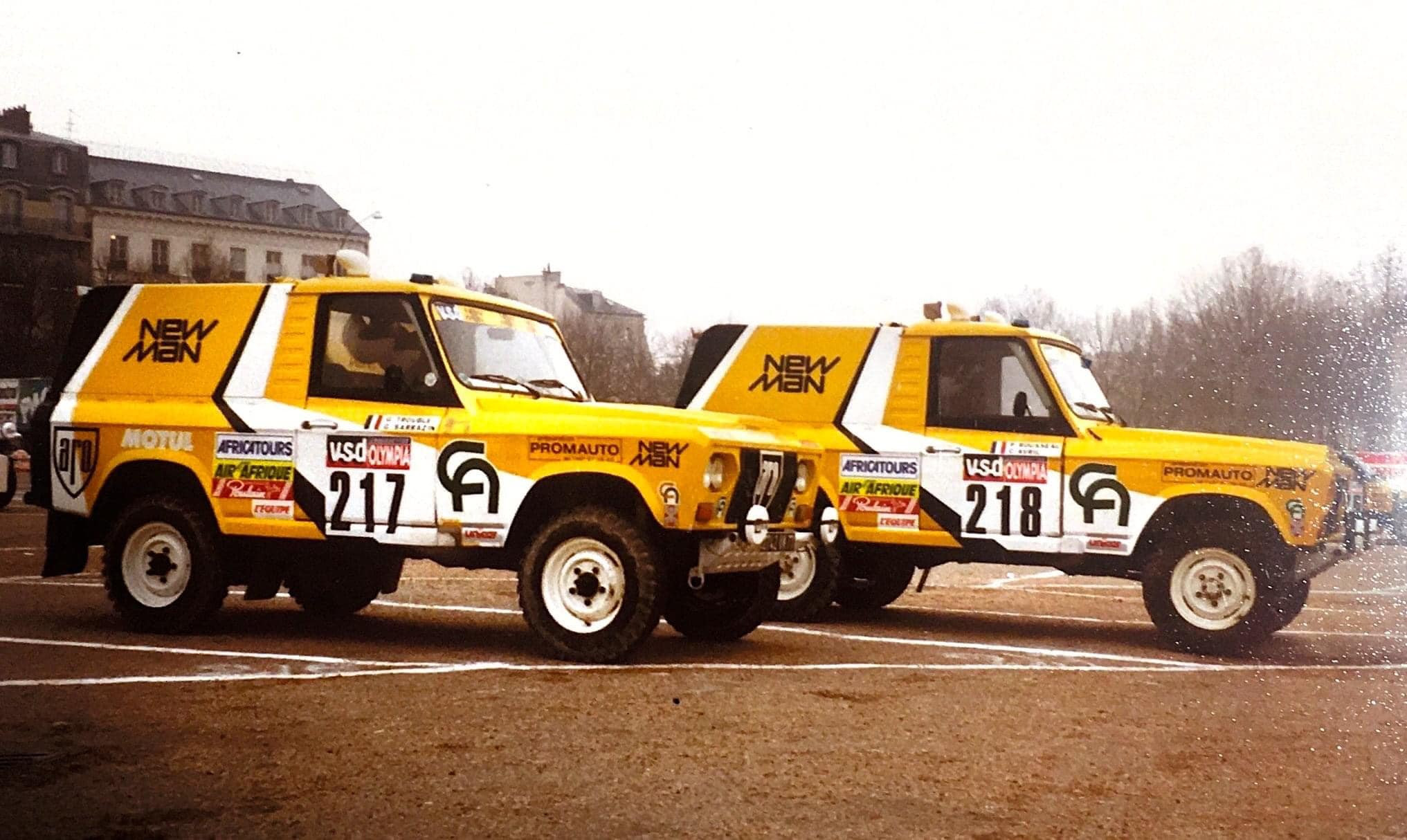 Cele două Aro în culorile NewMan la Dakar, în '85. Ca o paralelă ciudată, mașina care a câștigat cursa de la Le Mans în '84-'85 a fost sponsorizată de aceeași firmă