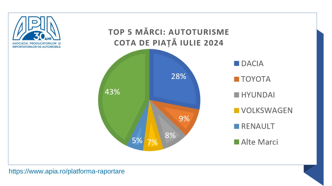 Asociația Producătorilor și Importatorilor de Automobile (APIA) a consemnat evoluția negativă a pieței auto interne în iulie. Astfel, în luna a șaptea a anului curent s-au înmatriculat 12.898 de mașini, cu 4,4% mai puțin decât în iulie 2023. Chiar și așa, dacă se contabilizează primele șapte luni ale anului, creșterea la înmatriculări este de 10% față de aceeași perioadă a anului anterior.