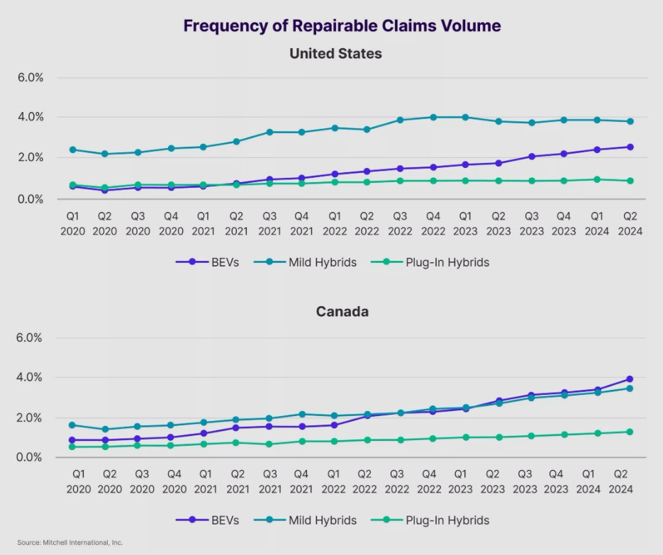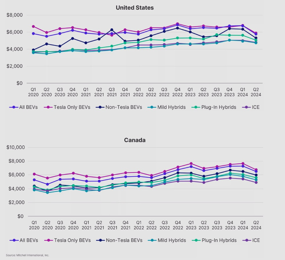 În medie, Mitchell transmite că valoarea medie a pagubelor pentru o mașină electrică în această perioadă a fost de 5.753 de dolari în SUA, respectiv de 5.534 dolari canadieni în Canada. Prin comparație, modele similare cu motoare clasice au înregistrat pagube medii în jurul a 4.806 dolari în Statele Unite și 4.958 de dolari în Canada. În procente, asta se traduce într-un cost de reparație cu 20% mai mare pentru EV-uri în Statele Unite și cu 31% mai mare în Canada.