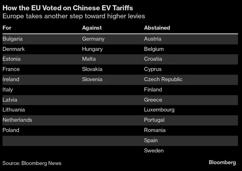 Cum au votat statele membre pe tema taxelor suplimentare pe EV-uri. Sursă: Bloomberg News