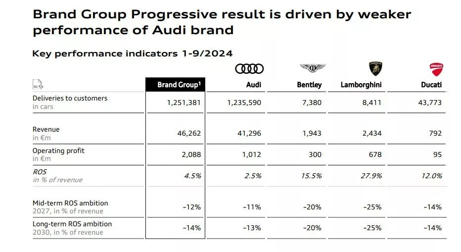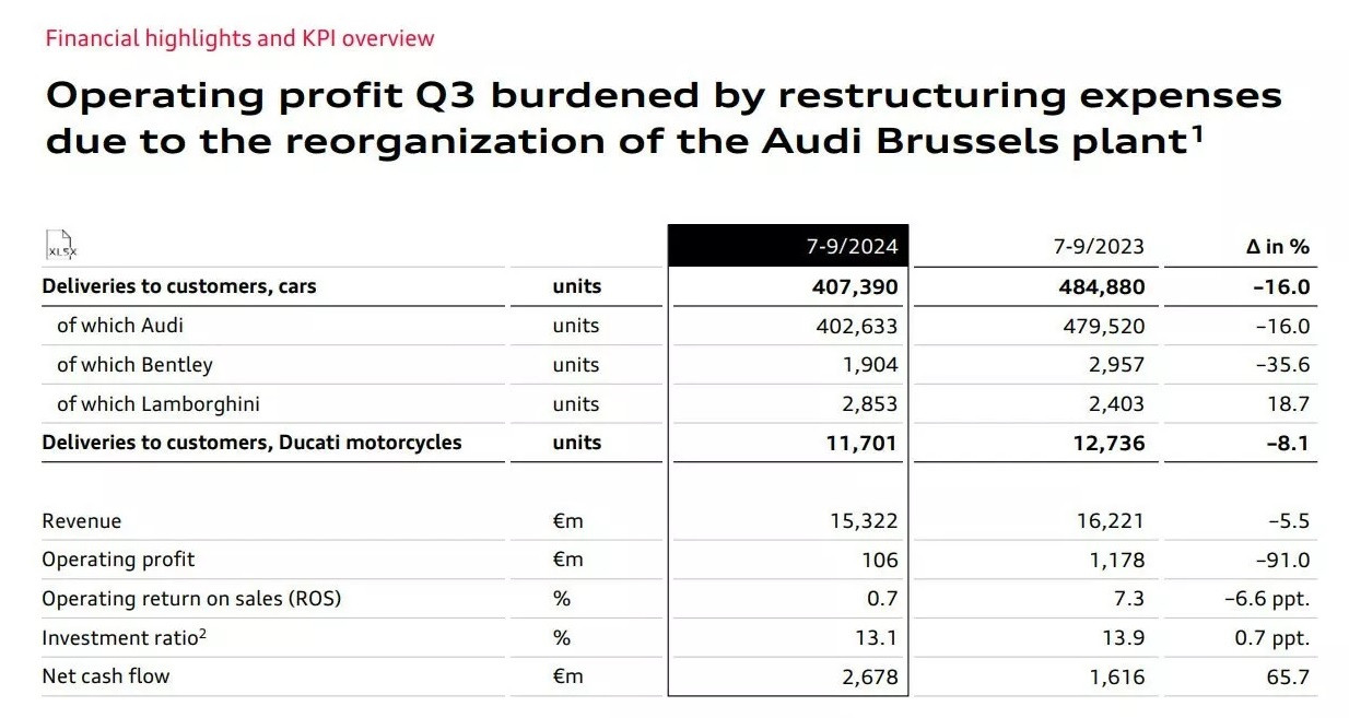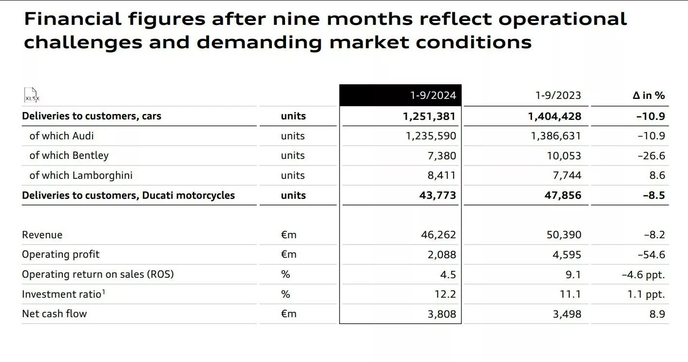 De aceea, veniturile s-au topit: de la 50,4 miliarde de euro în 2023, la doar 46,3 miliarde de euro anul acesta. De asemenea, profitul operațional al întregului grup a scăzut cu peste 50%: de la 4,6 miliarde de euro, la doar 2,09 miliarde de euro. Totuși, Audi trage speranțe că strategia agresivă de reîmprospătare a gamei, care a inclus lansarea a 15 modele și versiuni noi în 2024, va duce la o redresare a situației în Q4 și, mai ales, din 2025. Audi își pune speranțele mai ales în noul A5 (versiunea termică a lui A4 electric), respectiv în SUV-ul Q5.