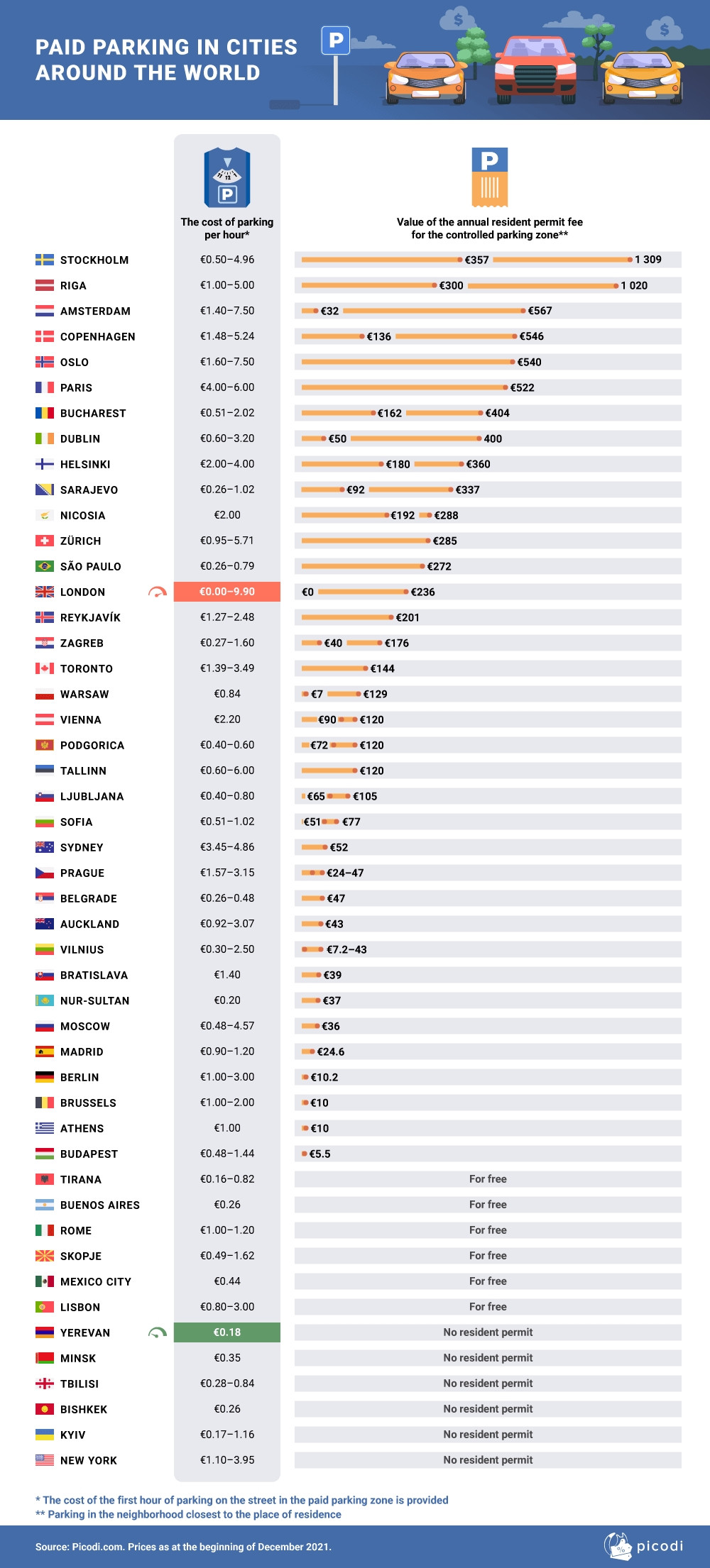 Lăsând la o parte situația din Capitală, Wall-Street.ro a aruncat un ochi peste cele mai importante orașe de pe Bătrânul Continent pentru a vedea care este situația și în „ograda altora”. Conform unui studiu al Picodi.com, orașul cu cele mai mari tarife anuale pentru rezervarea unui loc public de parcare este Stockholm, capitala Suediei. Acolo, permisele anuale de parcare au prețuri ce variază între 357 de euro și 1.309 euro.