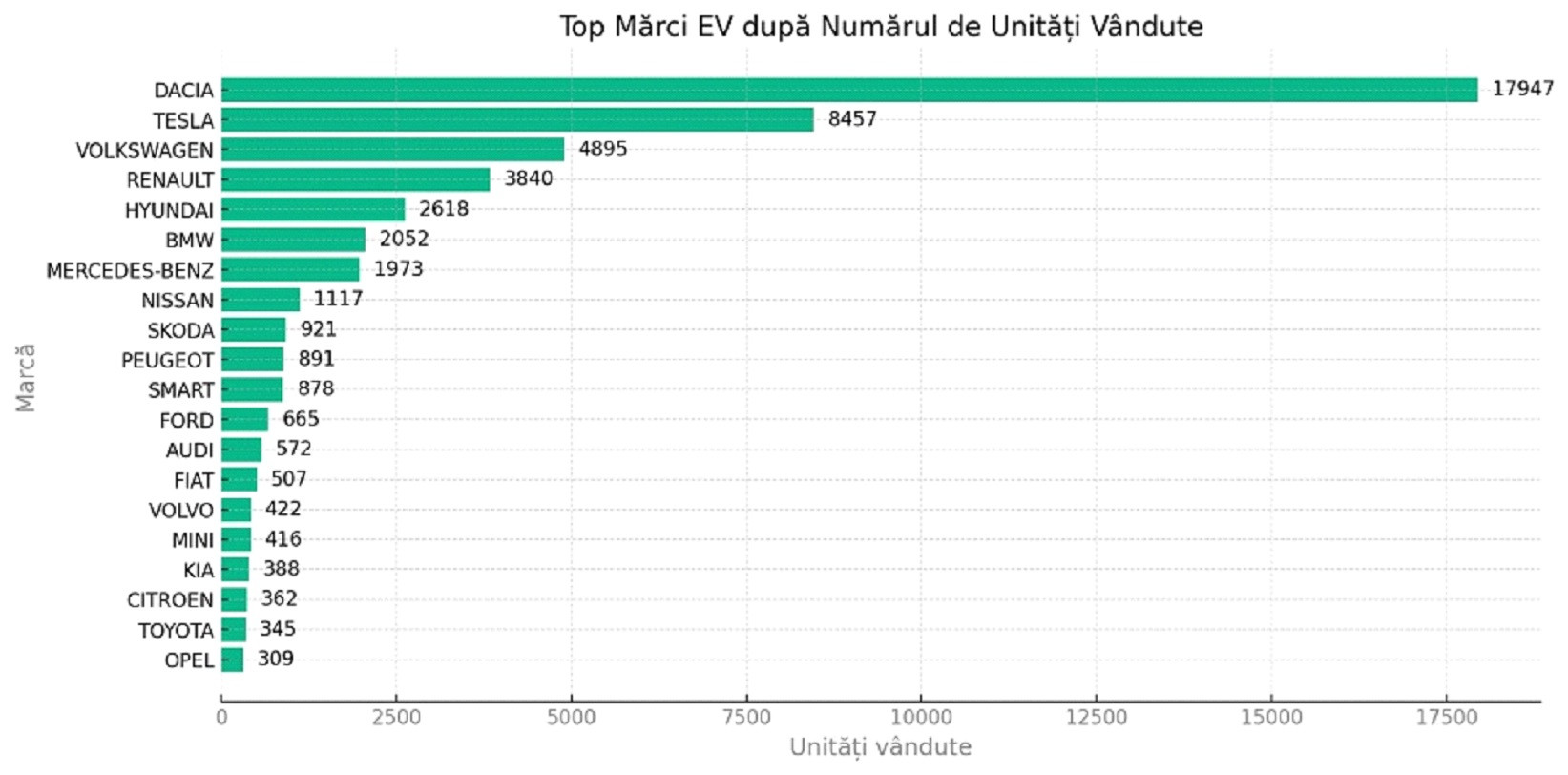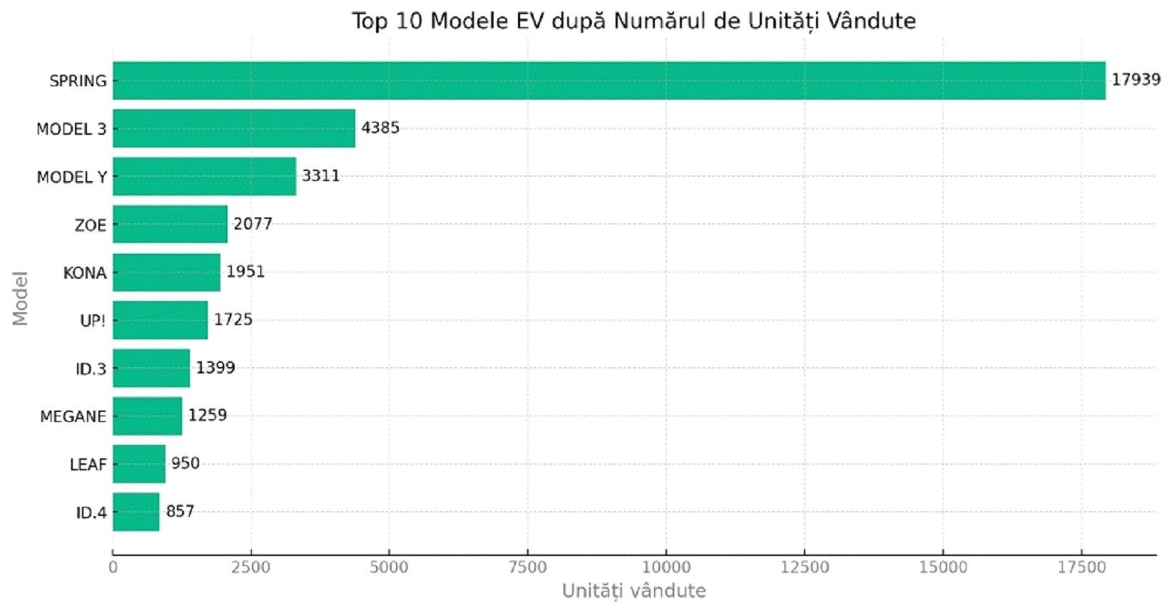 Dacia Spring conduce detașat clasamentul, cu 17.947 vehicule înmatriculate, fiind urmată la mare distanță de Tesla, care are 8.457 de înmatriculări. Podiumul este completat de Volkswagen, cu 4.895 de automobile electrice înmatriculate în România. Cele trei mărci auto reprezintă 61% din întregul parc auto electric din România.