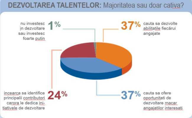 • 40% dintre respondentii globali arata ca managerii de nivel senior din companie inteleg problema si vad legatura dintre investitiile in dezvoltarea talentelor si rezultatele de business. La nivel european, procentul de manageri seniori care inteleg aceasta legatura este de 34%.
