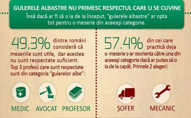 Desi 49,3% dintre romani considera ca meseriile sunt utile, acestea nu sunt respectate suficient, cel putin la nivel de opinie. In topul ocupatiilor respectate, nu se gasesc decat profesii care necesita studii superioare, pe primele 3 locuri fiind cele de medic, profesor, avocat/jurist, meseriile avand un procentaj mult mai mic.