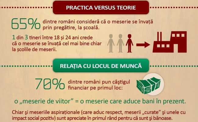 "In Romania, publicul larg aspira catre ocupatiile din asa zisa categoria a «gulerelor albe» – de exemplu parintii isi sfatuiesc in continuare copiii sa se faca medici, avocati/juristi sau profesori. Aceasta, in conditiile in care jumatate din romani considera ca a avea o meserie este mai important decat a face studii superioare, in special pentru ca o meserie permite celui care o practica sa «se descurce oriunde si in orice conditii»", explica Vlad Tureanu, partener D&D Research.