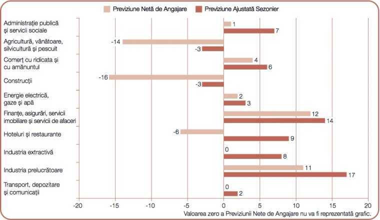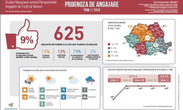 Previziunea Neta de Angajare ajustata sezonier este de +9% pentru al patrulea trimestru consecutiv, in conditiile in care 13% dintre angajatori prognozeaza cresteri ale numarului de angajati, 12% anticipeaza scaderi, iar 73% nu intentioneaza sa isi redimensioneze forta de munca in urmatoarele trei luni. Previziunea pentru primul trimestru din 2015 este cu 3 puncte procentuale mai puternica decat cea exprimata in trim. I/2014. Culegerea datelor a avut loc inaintea alegerilor prezidentiale.