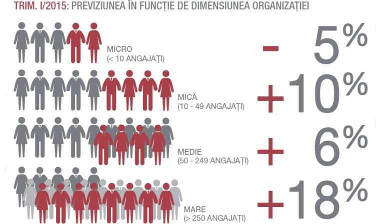 Planurile de angajare variaza si in functie de marimea organizatiei. Angajatorii din organizatii mari, de peste 250 de angajati, au cele mai ferme intentii de crestere a fortei de munca raportand o Previziune de +18%, de doua ori mai puternica decat media nationala, si mai robusta decat cele enuntate in trim. IV/2014, respectiv I/2014. In schimb, angajatorii din organizatiile foarte mici (micro), care au mai putin de 10 angajati, sunt mai putin dispusi la a face schimbari in forta de munca. 85% dintre acestia nu prevad nici o crestere, nici o scadere a numarului total de angajati in intervalul ianuarie-martie 2015, 12% anticipeaza o scadere si doar 2% fac planuri de angajare. Ca urmare, previziunea pentru micro-organizatii este sumbra, valoarea de -10% fiind sub cele enuntate atat in trim. IV/2014, cat si in trim. I/2014.