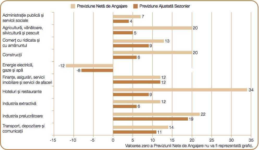 Cea mai abrupta scadere fata de trimestrul anterior, de 13%, este insa raportata de catre angajatorii din comert cu ridicata si cu amanuntul, unde previziunea neta de angajare este de +9%, fata de +22% in trimestrul II. Intentiile de angajare s-au restrans fata de trimestrul trecut in opt din cele 10 sectoare de activitate, au ramas stabile intr-unul, si au crescut cu o marja mica in cel de-al zecelea. Perspectivele sunt insa pozitive in ansamblu, cu exceptia sectorului energie electrica, apa, gaze, in care previziunea este de -8% pentru al doilea trimestru consecutiv, si nu a atins cote pozitive decat o singura data in ultimii doi ani.