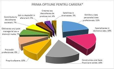 Astfel, 21% dintre respondenti considera ca primul criteriu in alegerea unei cariere este echilibrul dintre viata personala si cea profesionala. In topul importantei tinerii au nominalizat si specializarea in domeniul ales (19%), posibilitatea construirii unei baze financiare solide (16%), precum si sansa deschiderii unei afacerii proprii (10%).