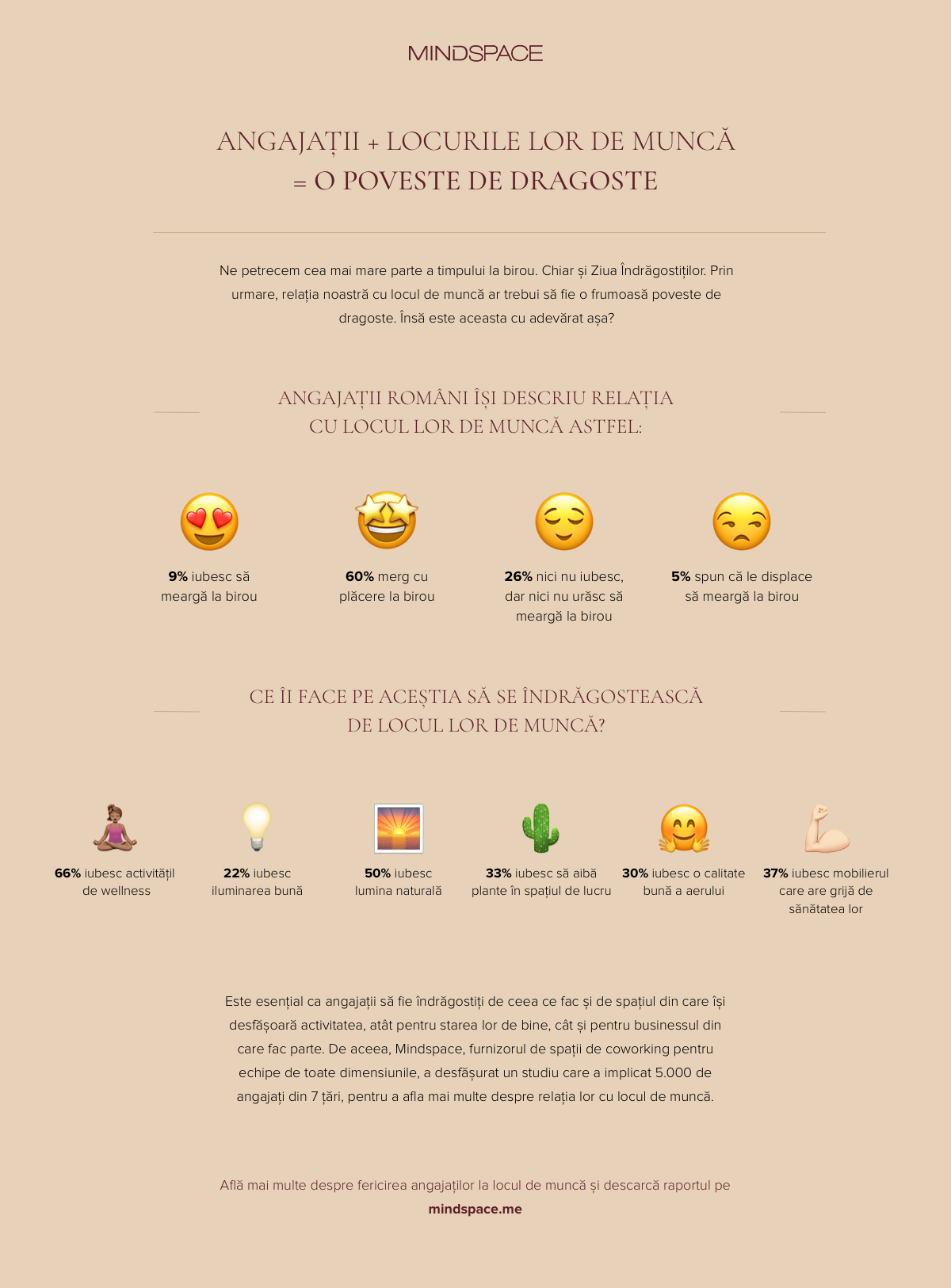 Potrivit studiului The Employee Happiness Survey, derulat in 2019 de Mindspace, 69% dintre romanii care desfasoara o munca de birou au sentimente pozitive fata de mersul la birou: 9% spun ca iubesc sa mearga la munca, iar 60% spun ca fac asta cu placere. Pe de alta parte, pentru ceilalti, relatia nu merge la fel de bine: 26% dintre respondenti au spus ca nici nu iubesc, dar nici nu urasc sa mearga la birou, in timp ce 5% au declarat ca acest lucru le displace.