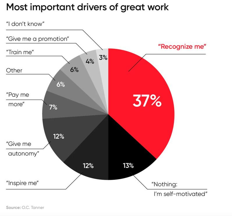 Însă pe lângă zilele libere și sesiunile la psiholog, munca unui angajat are nevoie de apreciere zi de zi. Un studiu recent publicat de Great Place To Work arată că aprecierea la locul de muncă este mai important aspect în motivarea angajaților (remarcat de 33% din respondenții studiului), alături de inspirație și autonomie (12% fiecare) și capacitatea de automotivare (13%).