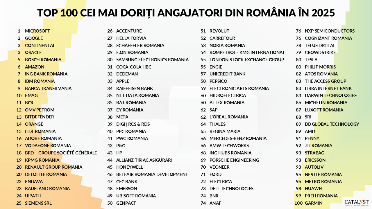 Catalyst Solutions anunță rezultatele studiului Cei mai doriți angajatori, derulat în perioada noiembrie 2024 – aprilie 2025 pe un eșantion de 12 161 de tineri la început de carieră, cât și profesioniști din România, din domeniile IT&C, inginerie, științe sociale și economice. Studiul reprezintă cel mai amplu instrument de evaluare a atractivității angajatorilor la nivel național, oferind o perspectivă detaliată asupra comportamentului și așteptărilor candidaților față de angajatorii locali. Rezultatele au fost prezentate, în premieră, în cadrul conferinței regionale de employer branding, EBcon 2025, pe 13 mai.