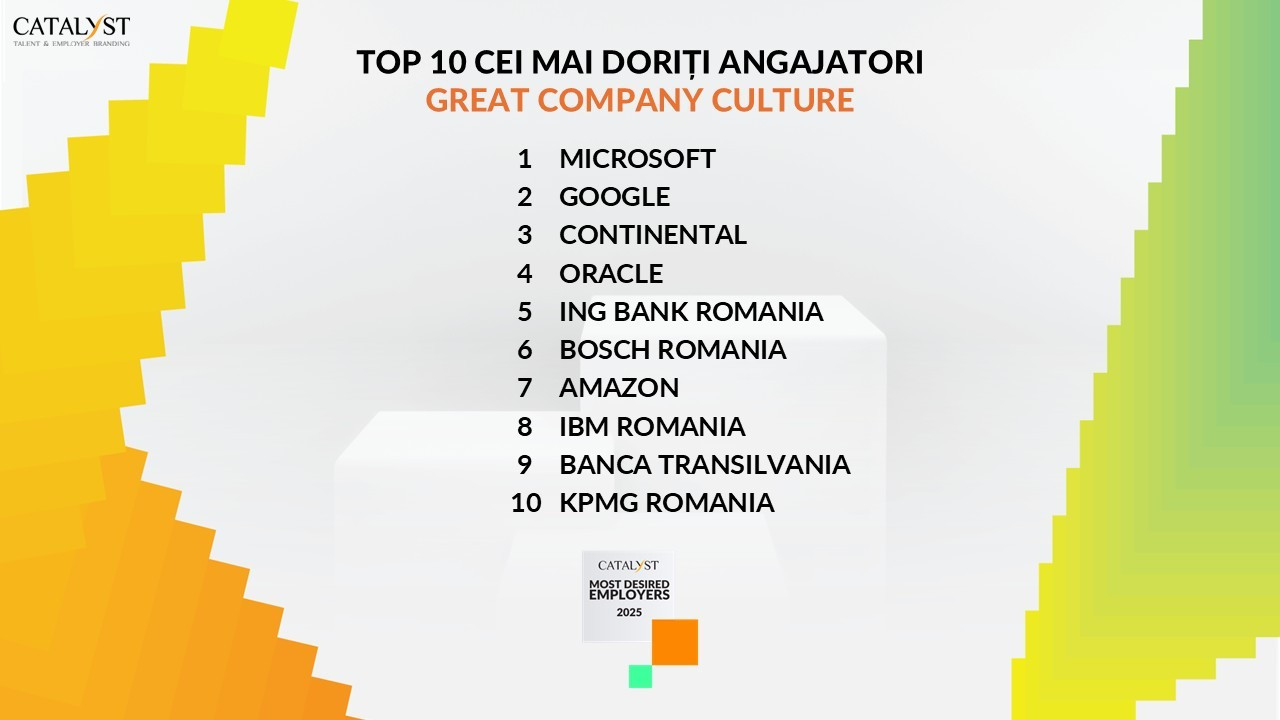 Pe lângă top 100 Celor mai doriți angajatori și New Entry, anul acest sunt prezentate în premieră Top Great Company Culture - un clasament care pune accentul pe cultura organizațională și pe modul în care aceasta contribuie la atractivitatea angajatorului. Acest top răspunde interesului crescut al candidaților pentru un mediu de lucru prietenos, echilibrul între viața profesională și cea personală, precum și pentru atmosfera relaxantă din cadrul companiilor. Astfel, pe lângă criterii precum pachetul salarial sau oportunitățile de dezvoltare, cultura organizațională devine un factor cheie în alegerea angajatorului dorit.